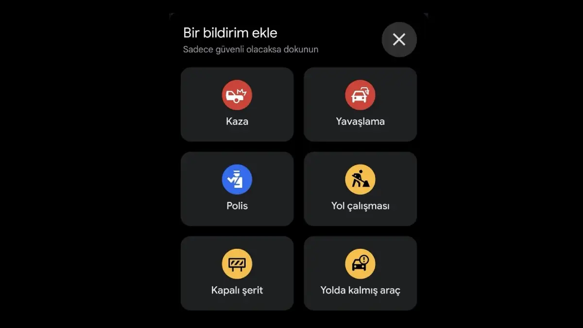 - “Bildir” veya “+” Simgesine Dokunun: Navigasyon ekranında, genellikle sağ kenarda veya ekranın alt kısmında, bir “Bildir” butonu veya içinde “+” işareti bulunan yuvarlak bir simge göreceksiniz. Bu simgeye dokunun.